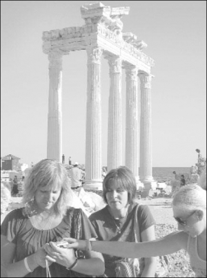Туристки з Києва фотографуються біля храму Аполлона. Вночі він світиться