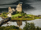 Замок Ейлін Донан, Шотландія. Це одне з найбільш знакових місць Шотландії, розташоване на острові, де зустрічаються три озера. Замок був побудований у 13 столітті, але відтоді кілька разів перебудовувався. Туристи можуть відвідати майже кожну частину замку.