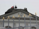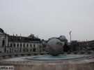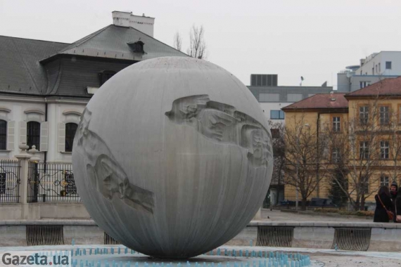 Перед палацом знаходиться фонтан Миру - земну кулю з голубами омиває вода. Біля нього зазвичай фотографуються туристи.