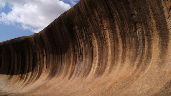 Скеля-хвиля сформувалася в результаті постійної дії води на граніт. А кольорові смуги на її поверхні - мінеральні відкладення, що залишилися від потоків дощової води.