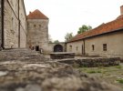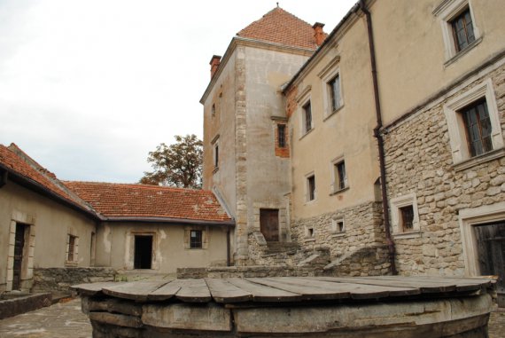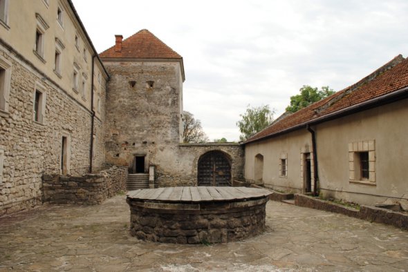 Замок має нижнє подвір'я. По центру - кам'яний колодязь, накритий дерев'яною лядою.