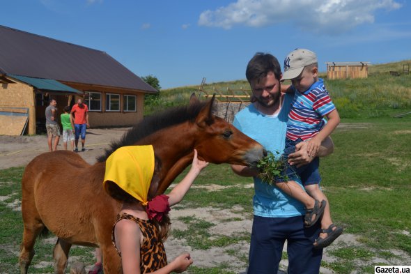 "Купили їх на шашлик гостям. Одного зарізали, а до інших руки не доходять. Так вони й гуляють. Людям подобаються. Не смердять, бо це спеціальна романська порода", - говорить Дмитро. За кухнею, на горі пасеться молода гніда коняка.