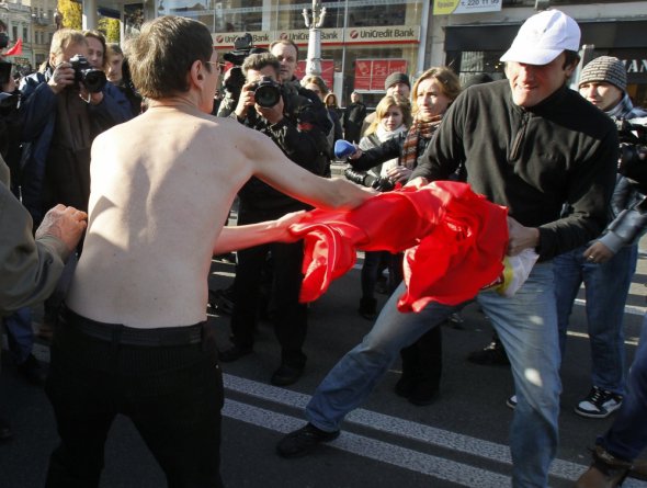 Комуністи, які проходили поруч, не змогли спокійно дивитися на те, як хтось витирає ноги ганчіркою, схожою на їхній прапор. За підтримки "Беркута" представники КПУ відібрали у активіста цей шматок тканини.