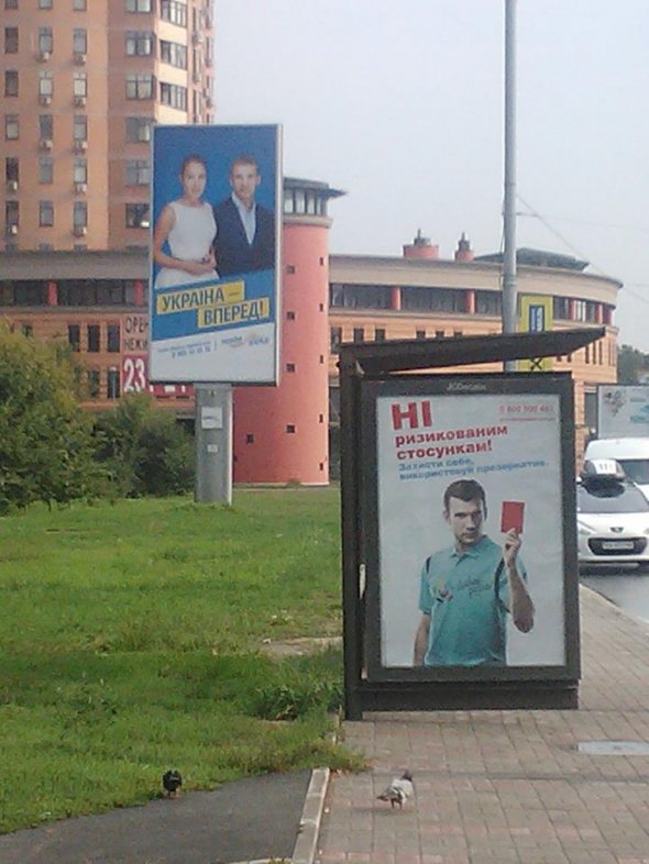 Один з мешканців столиці сфотографував у Печерському районі політичну рекламу з Шеченком, що стоїть поруч із соціальною. Гасло звучить як "НІ ризикованим стосункам". Інтернет-користувачі вже почали висміювати це гасло і пов'язують його саме з новими політичними стосунками футболіста.