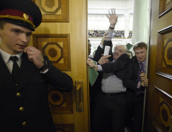 Коли ці два депутати заходили до сесійної зали, опозиціонери з криками "Тушок геть!" кинулися до дверей і виштовхали їх з приміщення.