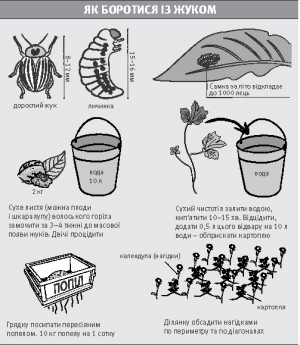 — Сусідка виписує їхню газету, дала мені проглянути, — каже Олена Іванівна. — Я почитала, взяла на пробу пакетик на 40 міліграмів, заплатила 7 гривень. Розвела на відро води. Пішла кропити в обід, бо у спеку колорад вилазить наверх куща. Сусідка порадила лити рясно, щоб добре намочити жуків і личинок.