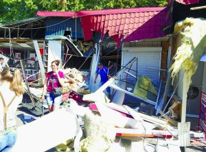 На тротуарі валяється бите скло, розірвані жмутки скловати, кондиціонери із вирваними кабелями, покрівля кіосків, манекени. Підприємці порпаються у купах, вцілілий товар складають у сміттєві пакети та відносять до авто.