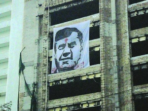 21 серпня з вікон недобудованого будинку на Львівській площі в центрі столиці вивісили 6-метровий білий плакат із силуетним портретом президента Віктора Януковича. На лобі глави держави — червона цятка, унизу підпис такою ж фарбою "Народ зможе".
