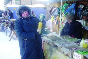 На ринку в Рівному за олією з вантажівки по 8,70 грн вишикувалася черга — місце в ній займали із самого ранку. Покупців не відлякує 23-градусний мороз.