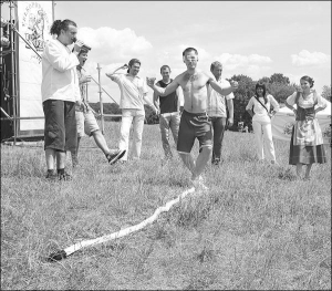 Другий ящик пива забирає хлопець, який найшвидше дійшов із зав"язаними очима по розтягнутому вздовж сцени канату.