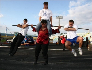 Турнір у Полтаві команди розпочали з перетягування канатом на 20 м вантажівки "мерседес", на кузові якої був "лендкрузер". Загальна вага авто — 6,5 т. У кабіні сиділи водій і пасажир. Потім по черзі підходили до залізної стійки, на якій були задні колеса легковика "Тойота Яріс". Їх піднімали з навантаженням на плечі в 300 кг. Також по двоє носили на 20-метрову відстань "запорожця" (600 кг), підіймали залізну колоду. Бігали з 130-кілограмовим балоном і мішком із 140 кг піску. Наостанок п"ять разів перекидали шини діаметром 2 м і на візку провозили 20 м три великі шини.