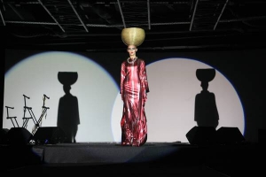 О 21.00 моделі В'ячеслава Дюденка з'являються на подіумі у довгих вузьких чорних сукнях. На головах — геометричні фігури до півметра заввишки, обтягнуті чорним волоссям.
