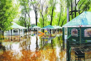 Дніпро підтопив пляжі та низинні ділянки в столиці. У парку Дружби народів позаливало відкриті кафе. Їх власники залишили у воді крісла, столи, мангали й біотуалети. У Гідропарку понтонний міст через затоку піднявся під кутом 45 градусів.