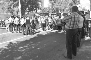 З'являються міліціонери. Стають поперек дороги. Під'їжджає автобус із бійцями спецпідрозділу "Беркут". За кілька хвилин демонстранти повертаються до ринку, усередину не заходять.