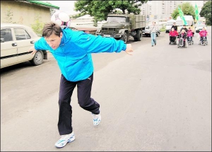 Микола Куценко на ходу жонглював футбольним м"ячем. За ним у візках їхали три учасники із громадської організації інвалідів "Прагнення", що в місті Бровари на Київщині.