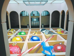 Малюнок можна роздивлятися із двох ракурсів: на першому поверсі, у дворику, та на балконі лаунж-зони НСК. На балконі місце, з якого найкраще видно картину, позначене наклейкою на підлозі.