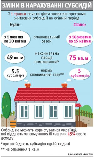Досі субсидію нараховували із розрахунку: 5,5 кубометра газу на 1 кв. м. Приміром, на квартиру площею 60 "квадратів" давали 330 "кубів". Наступного опалювального сезону цю соціальну норму скоротили до 5 кубометрів. Тобто знижку даватимуть на 300 "кубів".