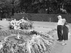 22 черня о 19.30 біля Вічного вогню міліціонерів не видно. Навколо чаші — квіти. Найбільше серед них гвоздик. Чоловік і жінка підходять до вогню і кладуть одну квітку. Мовчки стоять 2 хв. та йдуть до двох бабусь на сходах. Це сестри-близнючки 80-річні Галина та Марія Снігірьові. У руках тримають портрет маршала Радянського Союзу Георгія Жукова. Стверджують, що це його подарунок.