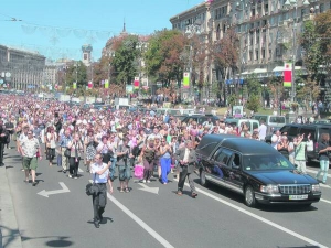 Катафалк, близько 20 автобусів і 30 легкових автомобілів їдуть на Байкове кладовище.