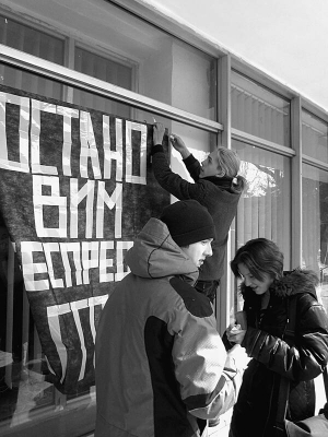 — Ректор після зимової сесії сказав, що не повинно бути стільки стипендіатів. Ректорські контрольні всі написали на "два" — спеціально завалили, щоб не платить, — каже російською Альона Скакун із четвертого курсу. Тримає плакат: "Хватит врать!".