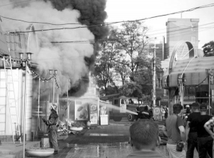 — Огонь над магазинами был метровый. Ветер высоко поднимал дым. Милиция не пропускала транспорт на Московскую, — згадує 23-річна Оксана Качуріна. Вона працює у фотоательє неподалік. Пожежу побачила близько 18.00, дорогою додому.