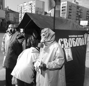 "Свободівці" у Хмельницькому збирають підписи проти добудови третього та четвертого енергоблоків на місцевій атомній електростанції. Почали минулого четверга. Мають 7 тис. Аби привернути увагу до проблеми, одягнули костюми хімічного захисту. Намети розбили у центрі міста.
