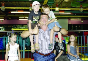 У розважальному центрі спортсмена обступають діти, просяться на руки. На плечі садить по двоє хлопців і дівчат. Щоб не впасти, вони тримаються за Сергієву шию.