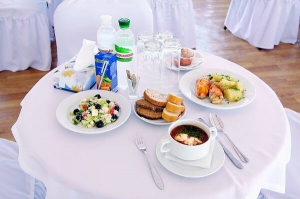— Уночі варимо. Потім машина з холодильником привозить їжу. Завтра буде котлета "по-київськи", суп-пюре зі шпинату, запечені овочі й салат, — розповідає Галина Грабовець, 58 років, директор фірми "Казка", що готує страви. — Салати тільки на оливковій олії. Я все життя в цій сфері. Після того, як поїдять, завжди йду на кухню дивитися, що залишилось у тарілках. Так знаю: що сподобалося, а що ні. Усі тарілки носимо порожні. Значить подобається. Один чоловік з'їв весь обід, потім пішов із підносом до кухарів. Узяв ще три миски з борщем.