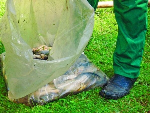 Працівники парку несуть на утилізацію чотири целофанових мішки загиблої риби. Вона розміром із долоню. Частину забрали на експертизу санітарноепідеміологічна станція та ветеринарна служба.
