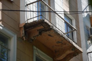 "Обережно, падає штукатурка". Шість таких оголошень розвісили по периметру будинку № 68 на вул. Богдана Хмельницького. 17 травня з балкона квартири письменника Олеся Гончара на третьому поверсі обвалився шмат плити. Ніхто не постраждав.