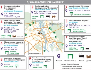 Смажити шашлики міська влада дозволила лише в 38 спеціально відведених місцях. Розташовані здебільшого за Кільцевою дорогою. Кілька — під містами Бровари, Вишгород, Ірпінь. Туди можна дістатися лише автомобілем.