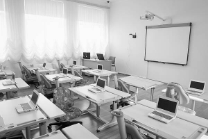 Показує приміщення для першокласників на другому поверсі. У три ряди стоять ортопедичні стільці та парти. На кожній — нетбук.