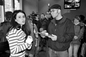 У суботу близько 13.00 Вадим Красноокий, лідер гурту "Мед Хедс", стоїть біля столичної кав'ярні "Шоколадниця" на вул. Богдана Хмельницького. Тримає у руках скляну тацю з гнилим кабаком, обмотаним подарунковою стрічкою. Мережа цих закладів разом із "Кофе Хаус" та "Кофеум" визнали одним із найбільших порушників мовного законодавства. Дослідження проводив громадський рух "Не будь байдужим". Його проект-менеджер Олена Подобєд-Франківська тримає три білі зів'ялі хризантеми.