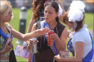 — Розумію, для них це свято, їм дуже весело. Але має бути якась етична норма. Подивіться, вони всі п"яні. Пиво, шампанське… На це спокійно дивляться класні керівники й міліція. Прошу дітей, аби прибрали пляшку, вони відповідають: "Ти за це отримуєш гроші". Дуже прикро, — нарікає прибиральниця майдану Незалежності 57-річна Лідія Островська. З її слів, на центральній площі Києва у фонтанах купаються третій рік поспіль.
