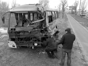 На вулиці -8°С. Чоловіки довго хукають у долоні, піднімають передню частину автобуса на домкрат. З боку водія вона розбита вщент. Всередині салону на підлозі біля передніх дверей лежить Біблія. Шість пасажирських місць погнуті або виламані. У них, напевне, впиралися пасажири в момент різкого гальмування або удару, припускає один із робітників. Металеве поруччя біля передніх дверей "Богдана" вирване з кріплень.