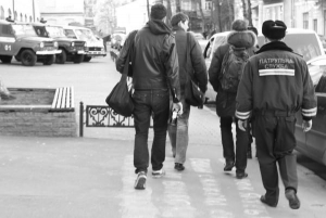 Двоє сержантів патрульної служби ведуть Олександра на вул. Хорива, 20, у Подільський райвідділ міліції. За 15 хв. трохи переляканий Косень виходить звідти.
