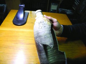 — Пляшка розбита майже на 30 частин. Ми зібрали її докупи, але не вистачає ще кількох фрагментів, — говорить керівник експедиції історик Микола Ільків, 33 роки. — Зроблена із кам'яної порцеляни та вкрита спеціальним розчином для міцності й водонепроникності. У Європі тих часів намагалися розкрити таємницю китайської порцеляни. В процесі винайшли свою. Вона далека від ідеалу, але дуже міцна, тому часто йшла на виготовлення посуду. Об'єм пляшки становить майже 1,5 літра.