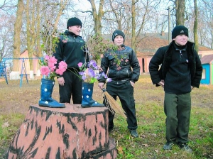 — Щоб не дуже сіро виглядали, попросили психолога Ольгу Іващук розмалювати чобітки у білі цятки, бо виду не мало ніякого. До пенька їх прибили гвоздями, насипали туди землі. Прибиральниця посадила всередину бордові хризантеми, — продовжує директор. — Учителька малювання Лідія Українець розмалювала пеньок. І так поставили чобітки, ніби вони шагають.