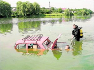 — Авто помітив наш наглядач, коли обходив озеро. Метра за 3 від берега на поверхні води виднівся дах, — каже начальник Вінницької міської рятувально-водолазної служби Володимир Коштурський, 33 роки. — Одразу повідомив черговому. Той зателефонував у міліцію.
