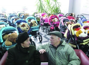 Чоловіки стають у чергу, пред"являють паспорти — свій і дружини. У кого дівчинка — отримують рожевий папірець, за хлопчика — блакитний. Це аби працівниця, яка видає подарунки, не наплутала з кольором коляски.