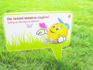 Два тижні тому на майдані Незалежності у Вінниці встановили таблички. Вони схожі на інтернет-віконця зі смайлами. Тексти на табличках написані українською та англійською — "Дякуємо, що підтримуєте чистоту", "Просимо не гуляти з собаками", "Запрошуємо скористатись Wi-Fi". Щодня туди приходять близько сотні людей скористатися безкоштовним інтернетом. Для зручності сідають або лягають на траву.