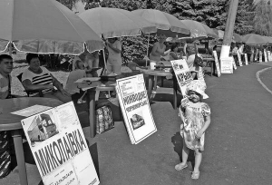 Жінка третій рік продає квитки на море. Каже, у пік сезону щодня записуються 15–20 людей. Щомісяця продавці отримують 1,7 тис. грн зарплати. На морі не були.