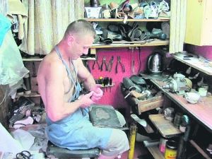 — Міліція мене любить, особливо дівчата, бо я всіх цілую, — жартує Олег Петрович. — У міліціонерів найчастіше стираються носки й підбори, бо багато приходиться ходити. На днях ремонтував чоботи артистам, козацькі червоні та чорні. Каблуки у театралів бумажні, то не знав, як їх зліпити. Одного разу суддя приніс у ремонт кімнатні тапочки, щоб я зробив профілактику підошви. Я й брати їх не хотів, казав, що я ремонтую взуття, а не тапки. А він подивився на мене й спитав: "А що, ці капці вам завинили чимось, що їх брати не хочете?". Мусів узятися. Ремонт вийшов дорого, вже не пам'ятаю скільки, десь більше 50 гривень. За ці гроші можна було взяти нові тапки. Ще часто заходить працівник із банку, то в нього круте взуття, десь до 1000 баксів. Та для мене разніці нема — чи директор прийшов, чи бомж — робити треба.