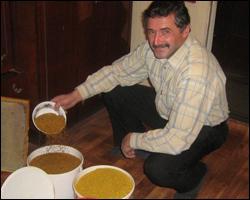 — Більше не можна, адже з пилку бджоли готують пергу. Це бджолиний хліб, яким вони годують своїх діток, — продовжує Валерій Леонтійович, відкриваючи пластмасове відро з пилком. — Ось бачите, тут він яскраво-жовтий. Це з кульбаби й ріпаку. А тут, — відкриває інше відро, — фіолетові та бордові гранулки. Різні квіти дають пилок різного кольору. З маку він чорний, з будяка, осоту — голубий, з груші й каштана — бордовий.