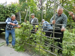 — Зимою по троє суток розчищали дорогу по трасі від Турбова до Погребища і на Сквиру. Техніка ламалася, не витримувала такої кількості снігу. Перемети були по півсотні метрів у довжину й до трьох у висоту, а треба було не тільки розчищати, а й правильно робити "кармани", — обрізує великими ножицями дрібне гілля Іван Сав'юк. — Коли чистили придорожні смуги, назбиралися купи хорошого гілля. Начальник автодору придумав робити такі щити. Наплели 70 штук, а треба хоча б 150. Завдяки їм зекономимо час і пальне на розчистку снігу.
