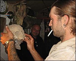 Роман — киянин, закінчив гурток археології. У Межибожі працює постійно. Позаду хати в Романа є сарай. На полиці — книги й археологічні журнали. Над ними — людський череп.