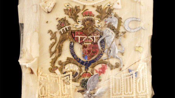 У липні 1981 року цей шматок одного з 23 офіційних весільних тортів вручили Мойрі Сміт - члену королівської сім'ї. На ньому зображений королівський герб, пофарбований у золотий, червоний, синій і срібний кольори, повідомляє BBC.