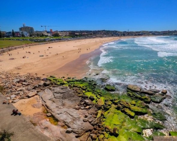 Пляж Бонді в Сіднеї. Назва пляжу перекладається як "хвиля, що розбивається об скелі". За відгуками відвідувачів є найпопулярнішим місцем для відпочинку. Тут білосніжний пісок та кришталево-чиста вода, говорять люди. Часто стає Меккою для серфінгістів з усіх куточків світу завдяки своїм високим хвилям.