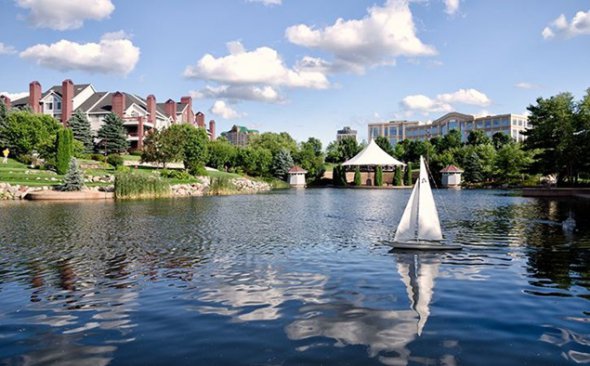Парк Сентеніал Лейкс, Міннесота, США. Парк, площею 97 тис. м², 40 тис. з яких займає озеро. Парк пропонує своїм відвідувачам міні-гольф та човни. Увесь він пронизаний стежками для прогулянок. Лавки для відпочинку зроблені у вигляді гойдалок.