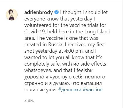 "Я подумав, що повинен повідомити всім, що вчора я взяв участь у випробуваннях вакцини від Covid-19. Їх проводили тут, у районі Лонг-Айленда. Вакцина створена в Росії. Я отримав свій перший укол вчора о 16:00 і хотів повідомити вам, що це абсолютно безпечно... Але я відчуваю себе трохи дивно і думаю, що витягнув ослячі вуха (орфографія та пунктуація збережені. – Ред.)", – написав Броуді у своїх соцмережах.